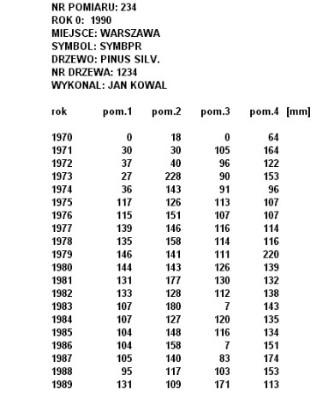 Pomiary tworzą zbiór kolejnych przyrostów rocznych mierzonego drzewa i na koniec mogą być zapisane w postaci pliku tekstowego, jako kolejny rok i odpowiadający mu przyrost do pamięci komputera w celu wyświetlenia lub przeprowadzenia dalszej analizy.